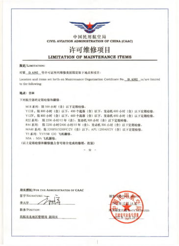公司維修業務涵蓋民用航空器、發動機、機載設備、機械部附件修理、零備件制造及技術服務。公司于1992年通過了民用航空器維修單位合格審定規定(CCAR-145部)和民航安全管理體系認證(SMS)。現具備Y5/Y5B、Y11、N5A、空中農夫、M18/M18B等通用飛機整機大修能力;Y12飛機800小時以下維修定檢能力;部附件維修能力;無損檢測能力(磁粉、渦流、滲透);T45、F16、毒蛇等無人機制造能力;具備法國“忍者”固定翼飛機、羅特威直升機、運動人飛機國內組裝、制造能力;羅賓遜系列直升機航線維修、翻修、定檢,以及O-540、IO-540、O-360型發動機300小時及以下定檢資質;新舟60飛機1C以下維修級別定檢資質。